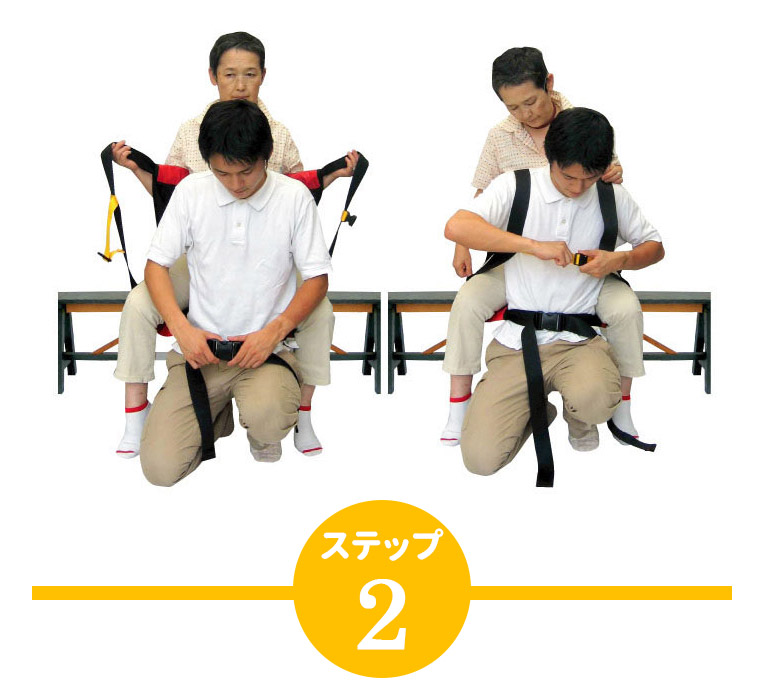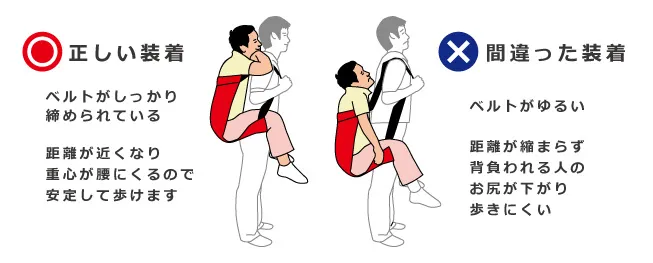 ・背負われる人をしっかり背中に密着させ、再度ベルトを強く引っ張ってください。