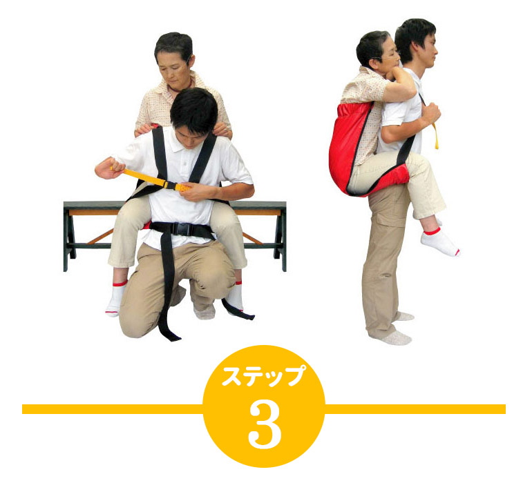 災害時の避難、介護での移動の時に、大人をおんぶしたまま、両手を使うことができる おんぶ補助具です。
